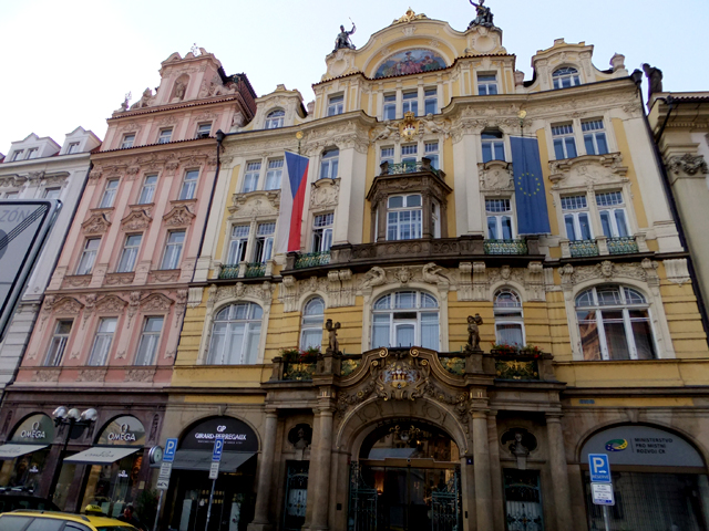 視線再由此逆時針轉,有醒目的一黃一粉紅建築。黃底那座本為防災保險公司,故最頂還可見金漆鋼盔與消防員雕像。或許這家公司資金雄厚,壁面除了刻著繁複飾帶,大門及窗臺也瑰麗地以新藝術風格金鐵盤繞。隔壁粉色那棟相較之下便稍微遜色,但這間金榔頭旅館(Hotel Goldhammer)早年可曾是卡夫卡父親經營的商店。