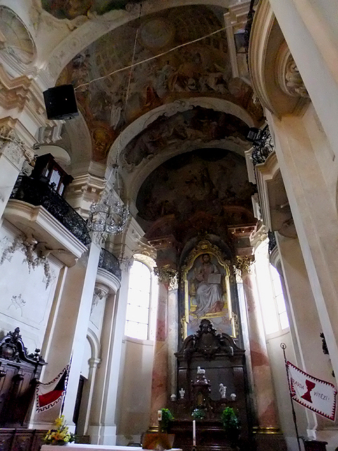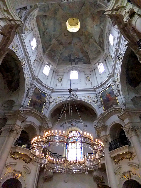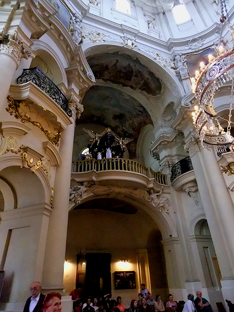 好在時間還不算太晚,大門是敞開的。由於教堂並不大,走進去便是拱頂下的高聳空間。當中醒目懸掛著水晶鏤空吊燈,環狀吊燈折曲成花瓣、帶著垂綴,閃爍璀璨光彩。周圍團繞的高柱間則有金色紋飾與墨黑雕欄,彷彿與吊燈呼應,也將二樓台緣切成流曲瓣葉。視線一路盤昇至天篷畫,畫裡正描繪著聖尼古拉斯的事蹟。然陰暗廳室內,雖有天窗透入之陽光,依舊無法辨明細微處,只能感受那瑰麗色彩與流暢線條。