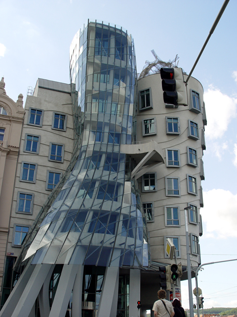 過了橋到達新城區,一棟奇特大樓從窗外閃過,那是「跳舞的房子」啊,我連忙緊貼玻璃盯著它的身影。在一片帶著舊時代色彩的房舍間,它的壁面綴上浪紋交錯的弧線,連窗戶也大大小小、不規則地上下隨其擺流。而稱呼它「跳舞的房子」,是因路口這側又嵌了座歪曲的玻璃帷幕樓閣,樓閣扭著軀體,延展出內縮腰身與飛揚裙襬,望過去,兩棟樓便似正相擁著翩翩起舞。