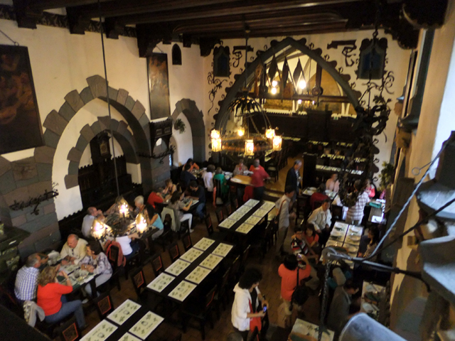 不過午餐餐廳的格局倒很應和城區古典,樹蔭外,相互疊切的紅褐瓦簷下,有淡色輕抹的古繪,呈現儀隊遊行與騎士對戰。走進廳裡,暗木桌櫥與肋拱間,斑黃壁畫細密勾描著城河景緻。似乎坐望著,就能倒流時光。