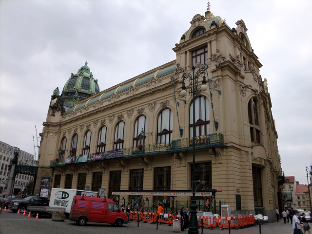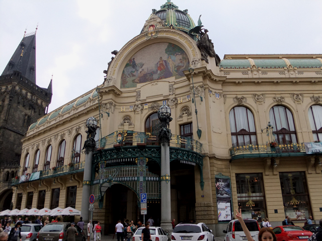 須臾,道路末端現出一棟帶著銅綠拱頂的醒目建築。那是市民會館(The Municipal house),曾為皇室宮廷卻在火焚之後,以新藝術風格的樣貌重新屹立。拱頂下的內凹弧面空間是幅馬賽克拼貼「讚美布拉格」,端詳了一下,原野間男男女女閒散靠躺,遠景有著朦朧城塔。不是很懂畫中這樣佈局的意涵,若不是單純風景描繪,只能猜度當中那位紅衣紫袍王者是布拉格的象徵了。