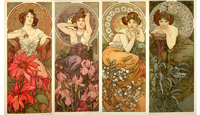而在「藝術」此四聯作,除了以女性擺弄身姿呈現音樂、舞蹈、詩歌、繪畫,尚可看到匠心獨具的框架裁切,外框之內又以拼花組成月牙勾框,便似畫中窗臺,在坐倚人物身後添上朦朧景深。這樣的設計也出現在我很喜歡的「寶石」四聯作,在此畫裡,作為背襯的內框改以馬賽克方式斑斕且細密地拼組成環,代表紅寶石、紫水晶、黃玉、祖母綠的女子在前景花束的裝飾下,以不同色系散發貴氣、嬌豔、慵懶、魅惑的特質。