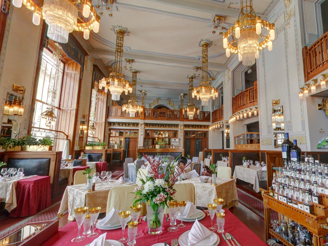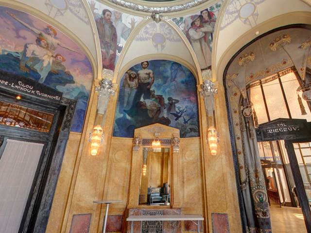 而在柱壁精美的人像雕刻外,綴金的銅綠欄杆從窗臺延伸至大門,若能從內側往外觀看,還可發現門頂的條欄間鑲有彩繪玻璃。這些花莖纏繞的雕欄是由慕夏設計,有別於傳統樣式的獨特風格。