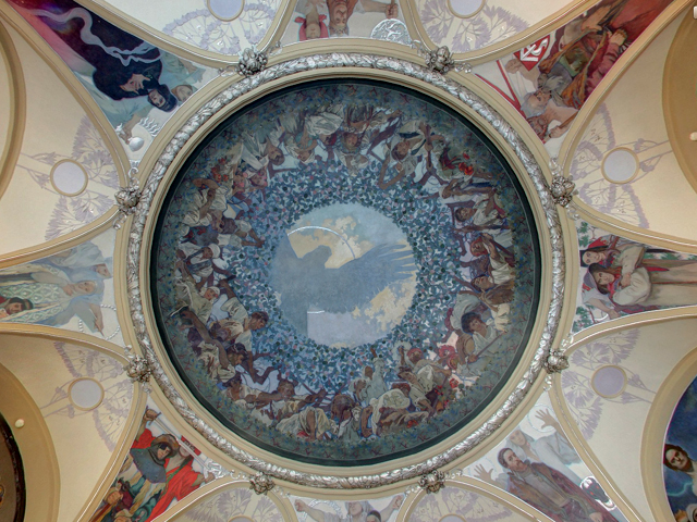 其實在布拉格正有一慕夏博物館,可惜沒見過旅行社將其排入。而眼前的市民會館亦有他的作品,從資料圖片看來,一樓兩側的咖啡廳及餐廳都以溫暖淡木色妝點雪白空間,並用華美的吊燈與鐘飾添加貴氣。若從寬敞的中央門梯轉上二樓,靠外的這面門通往市長廳。在這圓廳裡,鵝黃雲紋的牆柱間鑲嵌著帶抽象意念的彩繪玻璃,而慕夏的畫作便以肋拱為框,交替穿插至穹頂。有別於早期略帶商業性質的海報,這兒壁畫以革命自由的民族意識為主題,在戲劇性的構圖下,隱透著蘊含歷史的壯闊。