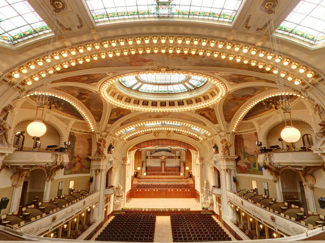 會館二樓的正中為史麥塔納音樂廳(Smetana Hall),淡亮色的廳閣裡,角落柱頂有著姿態飛揚的人物雕像,視線往上,掠過被肋拱切分的天篷壁畫,是邊緣綴著花葉的彩繪玻璃拱頂。每年的「布拉格之春」音樂會,這兒便會奏起悠揚曲目,讓人在樂聲中緬懷曾於此城上演的歡笑血淚。如此充滿文化藝術內涵的地方,我竟僅能與它對望片刻,便被迫與其錯身,著實令人嘆息。