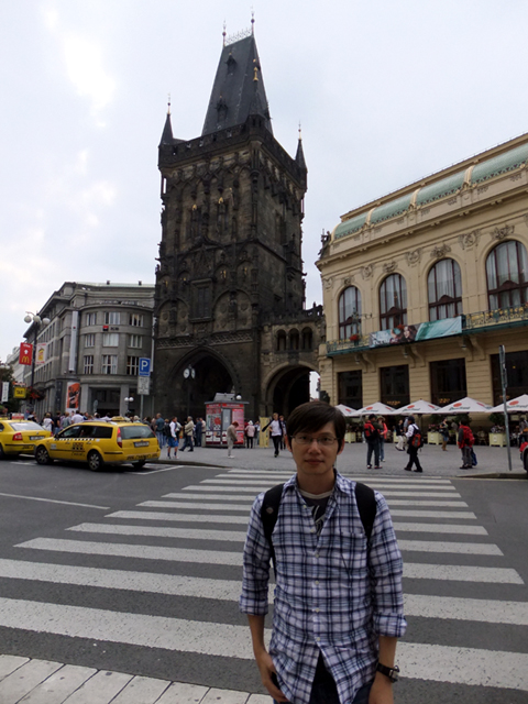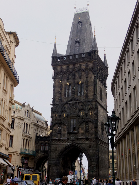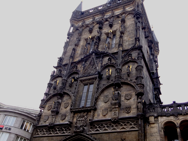 嘆息之餘,還是跟著隊伍走到與市民會館相連的火藥塔。與多彩亮麗的會館站在一起,此塔的黝黑色澤便是強烈對比。不過若仔細端詳被拱門通道洞穿的壁面,還是有不斷交錯的哥德式拱弧,攜著各樣徽記與雕像層疊而上,而被角落小尖錐環繞的陡斜頂簷望來便像個烏尖帽。