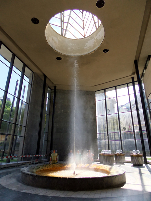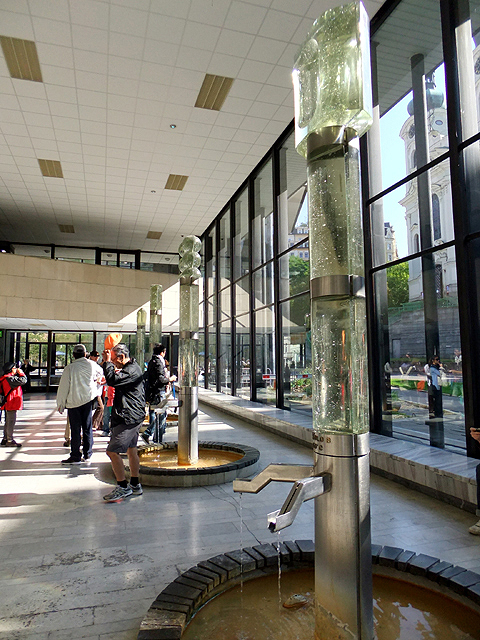 走著走著,大夥鑽進一處外觀普通的大廳。起初望見一堆溫泉杯、紀念品,我還以為是啥商場,直至看到幾個水池中插著玻璃金屬混合的管柱,才意會到這裡也是個溫泉迴廊。這個維吉特尼爾溫泉迴廊(Vridelni Kolonada)大概是想走現代簡約風吧,空空蕩蕩,只用大片落地窗引入陽光,總覺跟昨日音樂噴泉迴廊一比,平凡許多。