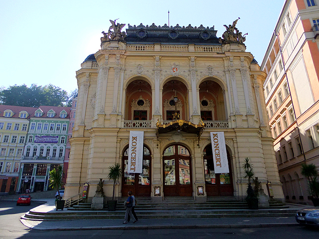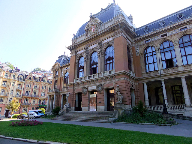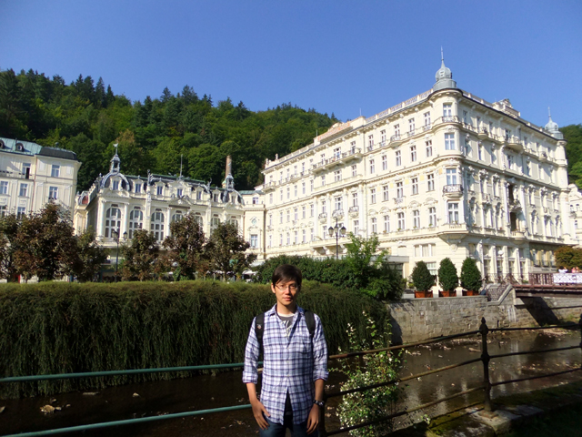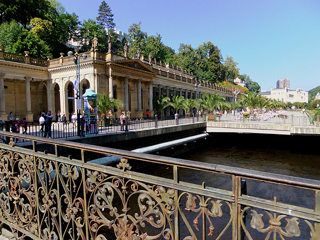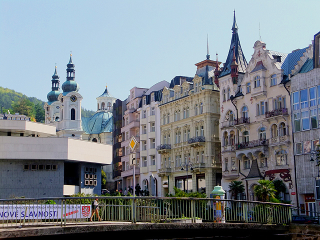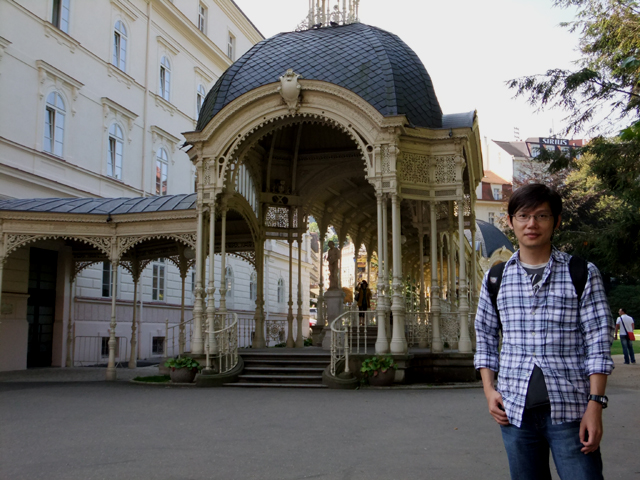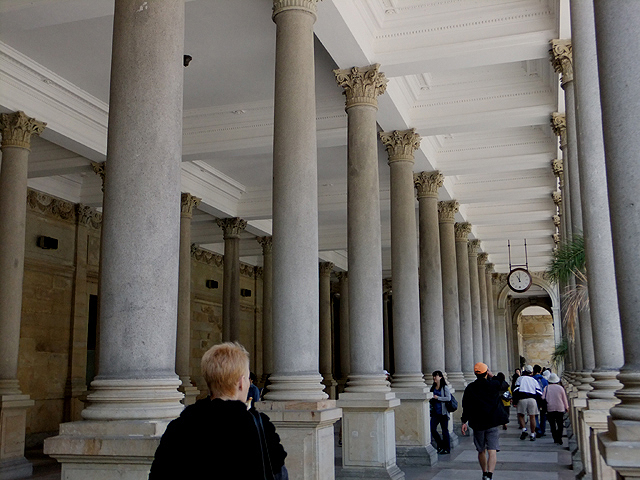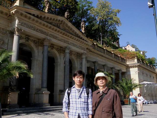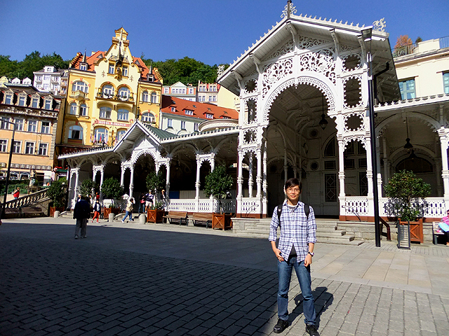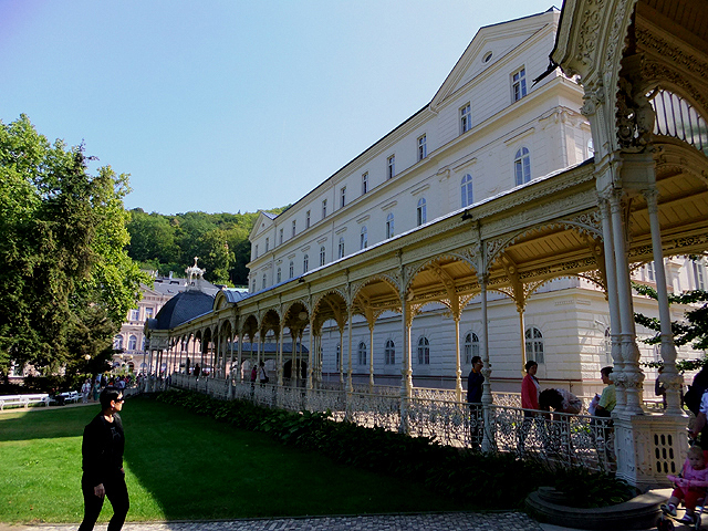 沒花多少時間,我們便抵達卡羅維瓦里,同樣是溫泉小鎮,不過遊覽車不能駛入,得再轉趟接駁公車。下車點附近有棟氣派建築,成排拱窗上為類似法國宮殿的那種屋頂,灰藍色微拱弧面,間隔鑲著小圓天窗。然它其實是一號溫泉澡堂(Lazne I),而非啥官邸大宅,可是連澡堂都這麼費心雕琢,足見於繁盛時期,有多少王宮貴族流連此地。