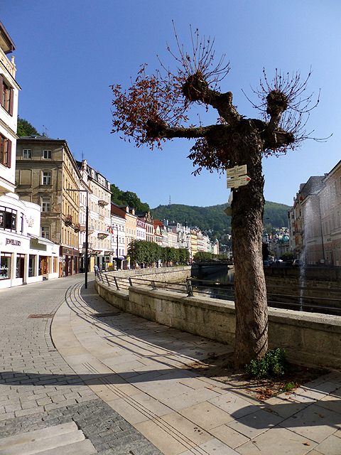 走到這兒,開始步入此城的繁華地帶,特普拉河(Tepla)從中劃過,兩側商家旅館依傍而生。這條河也有著溫泉水質,不時還能遇上泉柱噴出漫天水沫。而此地既然訴求休憩療養,河邊自然涼椅、植栽處處,讓人閒倚坐看波光。