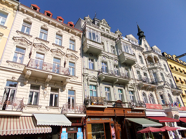 若要說豪奢,行過河上橋樑,便為知名的普普飯店(Grand Hotel Pupp)。雖乍看只是一片雪白的方正建物,但窗臺框架上也是有細緻綴邊刻飾。「終極假期」與「007:皇家夜總會」這兩部電影據說都在這取過景,裏面金碧輝煌,以大型水晶燈照亮四壁的畫作與鑲框,想必住上一晚的費用也令人咋舌吧。
