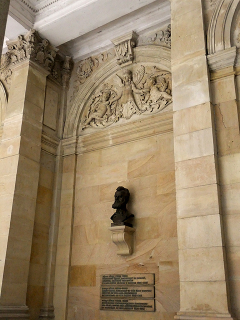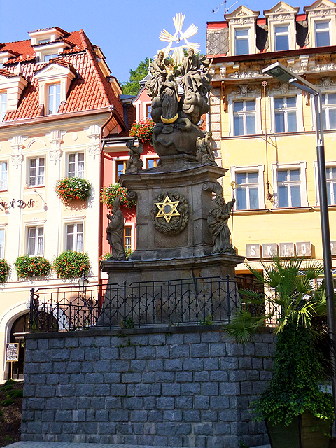 迴廊前有個黑死病紀念碑,一層層以主教、天使、加冕聖者堆砌而上,除了有生動人物團繞,在重點的六芒星、法器及冠冕都用金漆抹上輝亮,最頂代表聖靈的展翼翔鴿更是綻射聖光。