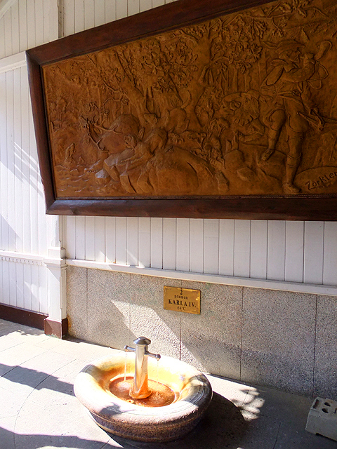 端詳須臾,我踏入廊內,樑木被支柱截成三道彎拱,同樣攜著蕾絲綴邊,一列列如虹弧般跳躍延伸整條廊道。左方廊末有口飲泉,其上牆面掛了幅木雕畫,描繪樹林裡,獵人與獵犬追捕雄鹿至一泉池。這幅畫中的獵人便為神聖羅馬帝國皇帝查理四世,傳言是他發現此具有療效的泉池,才有現在繁榮的卡羅維瓦里。