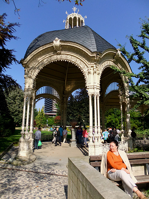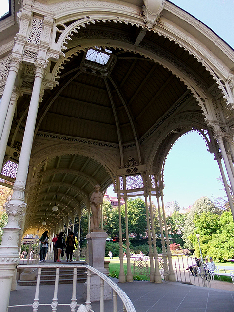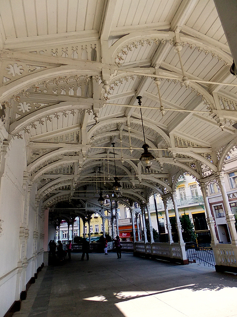 方對維吉特尼爾迴廊造型略感失望,可是才從另端走出,不遠處的市場溫泉迴廊(Market kolonada)便令我眼睛一亮。名稱雖喚作市場,但模樣根本與市場的雜亂隨便毫無相關。整體上,迴廊有幾座高低參差的山形簷,簷下門楣以鏤空雕花板作裝飾。最特別的是雪白細柱間,有若蕾絲般的凸綴,遍滿拱弧框格。望過去,在後方山坡五顏六色宅邸包圍下,更顯其纖細秀雅之氣質。