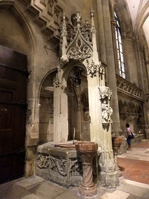 緩步往內踱去,經過一口同樣令我困惑的古井,上方還以精細哥德式尖拱頂罩著,會否也曾有過怎樣神跡呢?左右兩翼的偏廳各是個簡單的禮拜堂,僅略微妝點,於是我稍稍端賞後,最後停駐在正中的主祭壇。