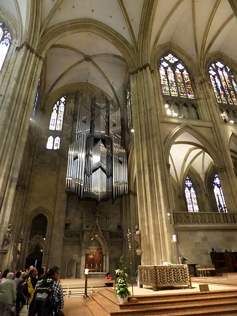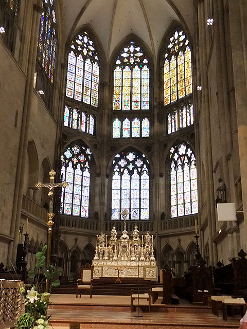 陽光從環繞的玫瑰花窗遍灑而下,透亮了窗花上一個個繪彩聖者先知,也將金色主祭壇映照得熠熠生輝。祭壇並未層疊朝天堆砌,但卻精精巧巧,以銀質十字架、燭台、雕像,凝聚璨光。我雖不能進前,但遠遠看著也能感覺它的細緻華美。