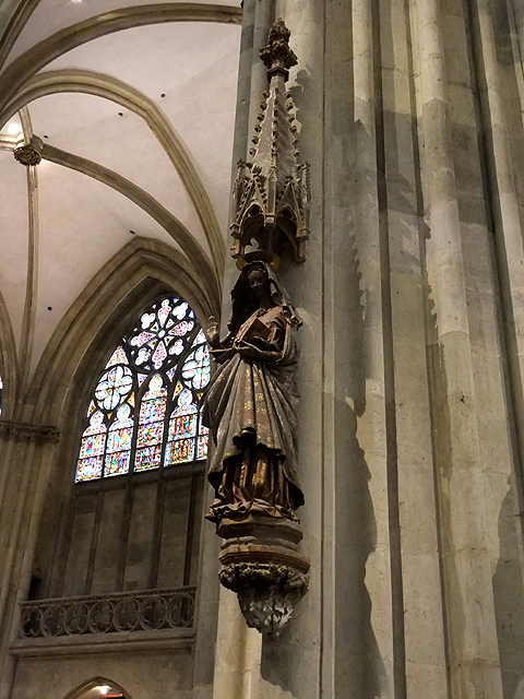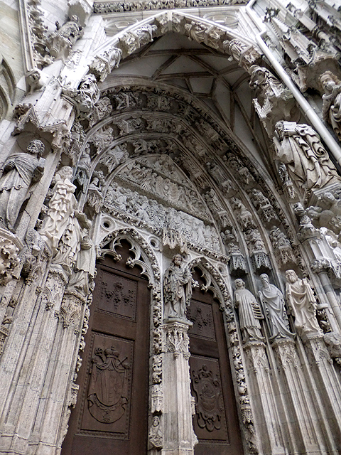 繞至正立面,駐足仰望。很意外地,左右兩側的窗拱堆疊並非呈對稱設計,不知是否也有其歷史因由。而中央大門很是特別,一根兀立門外的石柱撐起一方雕琢空間,石柱被尖頂龕座環繞,龕座內是聖者雕像,類似的雕像在其後的尖拱門框一圈圈環繞堆疊,配上門楣的人物石刻畫,遠望便似片碎亂浪花。