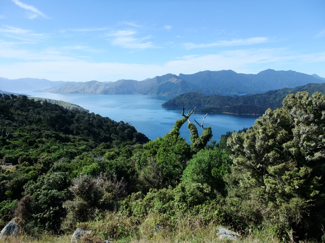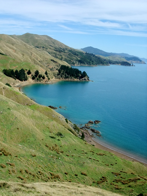 一夜過去,幸的是,今晨推開窗門,晴日從海灘一路透進,恣意且爽朗。當初米佛峽灣之所以被捨棄,便是因一年有幾乎三百天在下雨,假使換個路線,千里迢迢至此,所見峽灣依舊陰雨籠罩,那就過於悲情了。於是,懷著振奮心緒,我們往東北角的萬寶路峽灣(Marlborough Sounds)出發。