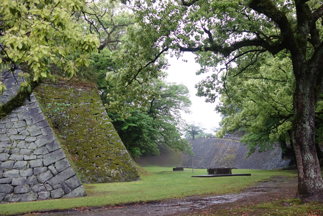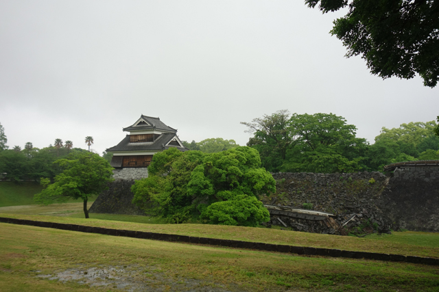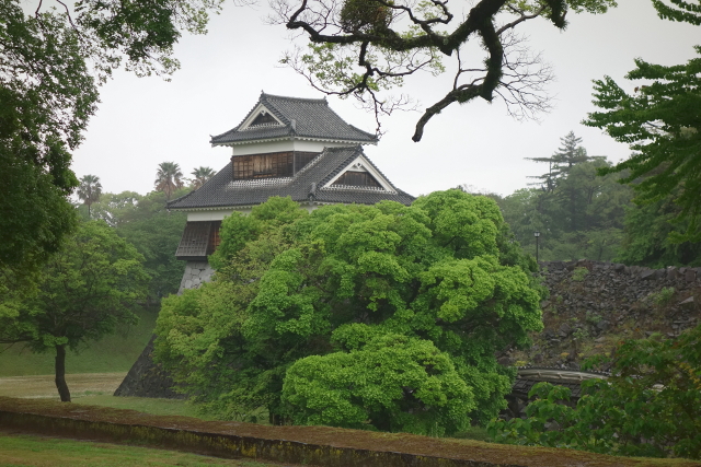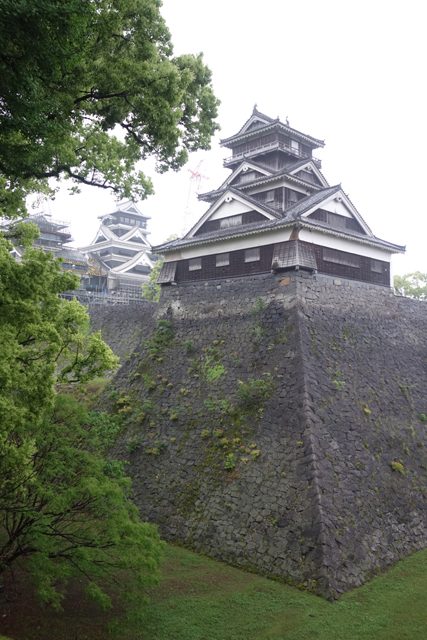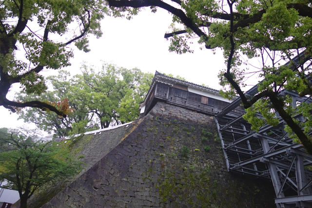 而由這個城區邊角拐往東,便能看到號稱第三天守的「宇土櫓」,它有著外三重、內五層、地下又一階的結構,三角形的千鳥破風剛冷切劃,牆面與窗板顯著歲月浸潤後的斑駁,近衛老將般,滄桑卻不減其英武。所處的城牆是所謂的「武者返」,底部斜擴增加穩度,上部拉升為垂直,就算腳力極強的武者也無法不憑工具攀攻。據說城裡此等規模的高閣到明治時期還有四個,但拆的拆毀的毀,如今也只有它殘存下來,是有某種神靈在此駐留加持嗎?想到它又撐過這次的地震災厄,便覺不可思議。