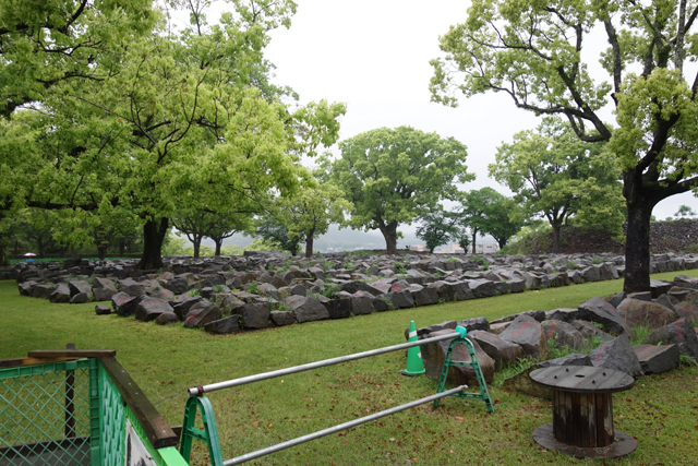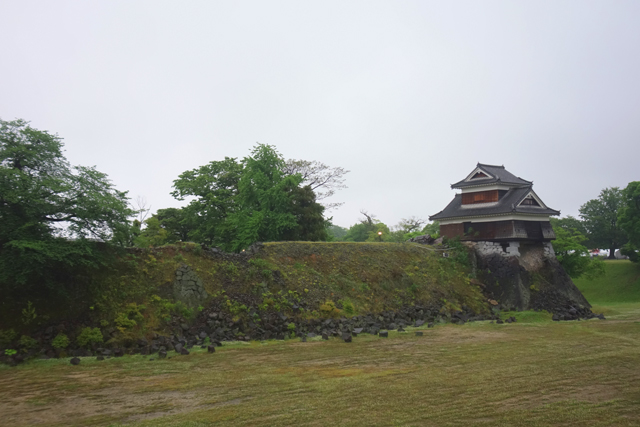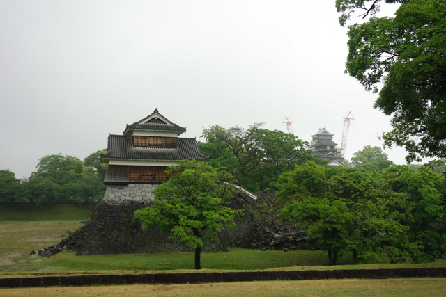 順著指標向東走,停車場所在的「二之丸」於江戶時期是上級家臣的屋舍,現在看來只是個光禿禿的廣場,再過去,是城區的第一道防線「西出丸」,「西大手門」在此以樓閣扼守,也為整座城池規格最高的門戶。它於明治時期曾被拆除,好不容易復原,卻又被地震重創,我從封擋的路口望進,旁側的「元太鼓櫓」已崩塌得如同碎石坡,匿在轉彎處後的「西大手門」估計也是類似命運。