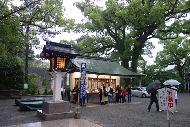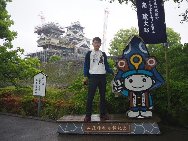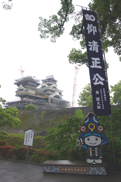 神社院落除了供人緬懷歷史、觀看天守的修復進度,也放了「仰清正公」的長幅旗幟,有身穿將軍盔甲的Q版娃娃在台座等人跟他合照。娃娃身分滿容易猜,結合神社名字,顯然是「加藤清正」的化形。此人對「熊本城」有著重要意義,雖說「細川忠利」為初代藩主,但沒有「加藤清正」就沒有眼前這座城池。他是「豐臣秀吉」自小培育的家臣,也是其頭號猛將,率軍統一九州,分得一半的「肥後國」後,便開始於「茶臼山」砌城拓展,初代天守閣便是他的手筆。據說他對建城頗有一套,「江戶」、「名古屋」都曾經手過,不能深入走訪,感覺其間造景的層次及防禦佈局的微妙,很令人遺憾啊。