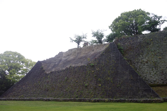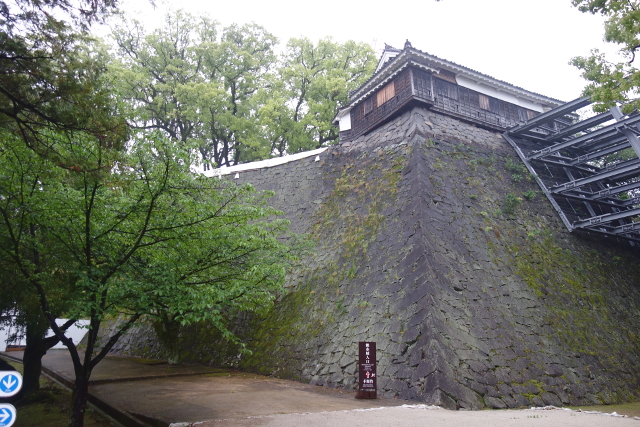 繞出神社,隨坡下行,北東部分的城牆基本與馬路相切,近距離望著「武者返」弧狀拋升,感覺牆體又更加高聳。原以為這區受損不大,走了片刻便見碩大鋼架扶按著城壁,彷彿若少了這力道,就會瞬間倒塌。根據標示,頂頭那棟長樓名曰「平櫓」,與旁邊坡路上的「不開門」形成這區段的隘口。