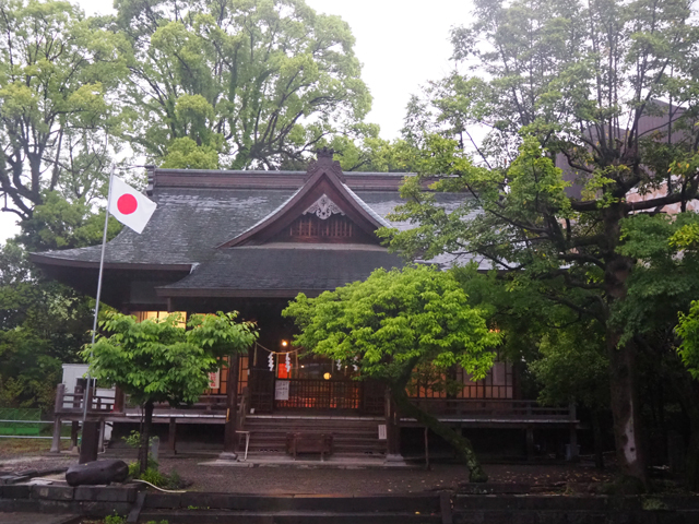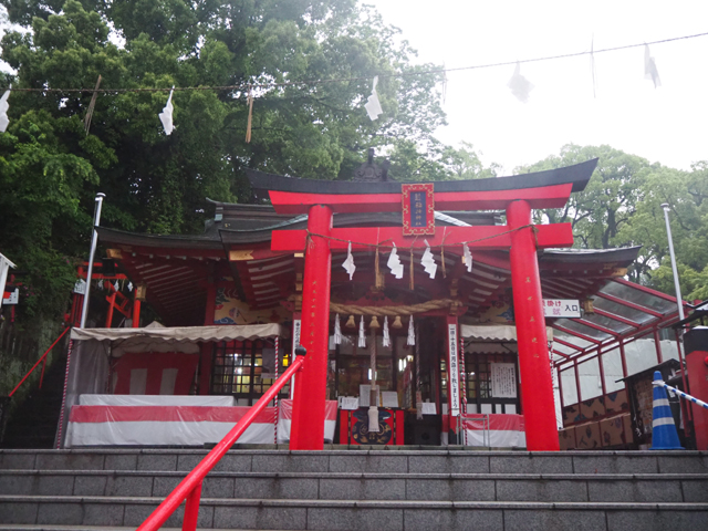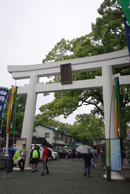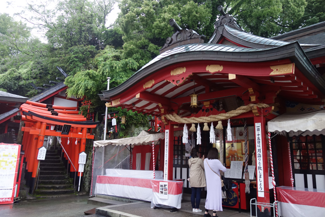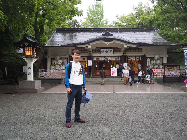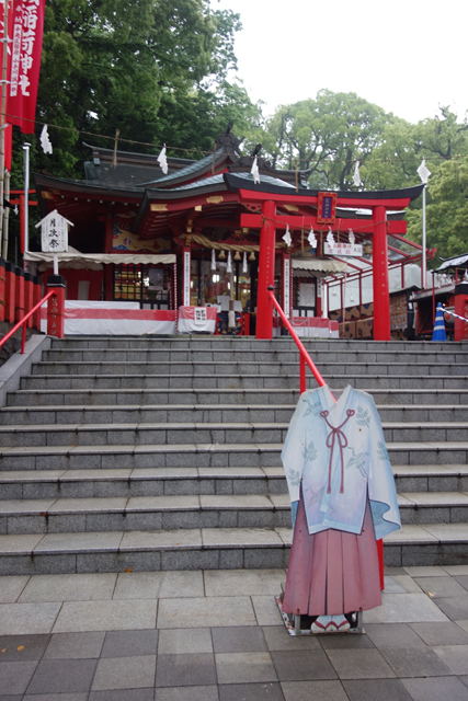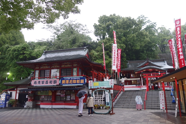 環後醒目的雙層建築並非本殿,得從一旁的階路再往上,可能是為了提振氣氛,階底放了一塊衣裝如神官的立板,讓人促狹假扮。拍過照後幾步登階,雙層建築的二樓是「神樂殿」,與其緊依的上丘路朱紅鳥居併疊,不免好奇著盤轉之後是否也有長龍般景致,可是時間殘酷緊咬,我只能往裡瞄個幾眼,便將這份好奇丟棄。儘管相關元素皆具,相比各地「稻荷」的人潮如織,這裡的本殿冷清許多,也及不上「加藤神社」的熱鬧,走探的這段時間裡,僅見一組遊客,感覺地震的重傷使不少人把「熊本」從旅遊規劃中刪去。