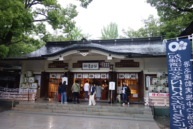 除了建城才能,由於他曾於領地治水,又在攻打朝鮮立了武勳,再加上雖靠向德川,卻始終對原先的豐臣氏族忠誠,在日本人心中形象相當好,便逐漸成了信仰,有了相關神社。我往周邊望了望,兩側各是御守販售處及提供御朱印書寫的社務所,正面顯然是本殿,儘管沒有多重閣簷花俏砌築,只以一線淺弧簡樸作飾,兩側酒樽的堆疊,幾處書法的龍飛鳳舞,就莫名讓視覺豐沛起來,遮簾的圖案感覺也有名堂,查了一下,原來是結合桔梗與蛇眼的家徽。