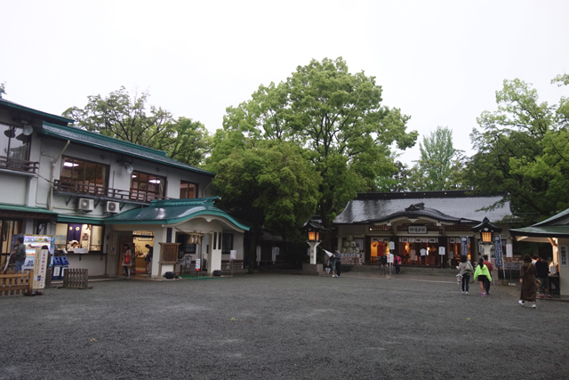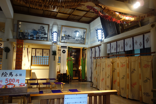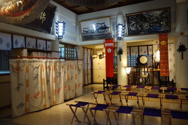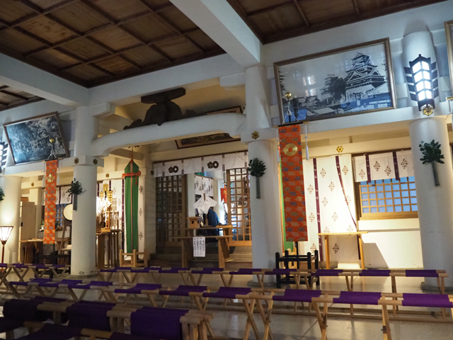 避開中線的參拜人群,我從旁窗往內望,除了觀禮用的座席,牆邊都佈滿妝點,並非金炫的複雜雕工,而是不同繡紋的布簾披垂環圍,頂部有些黑白老照片,記印舊時的神社和天守閣,旁側還置了面相森然的墨深盔甲,不知是否為「加藤清正」之物。不免也認真盯瞧了心處的祭壇,可惜視角不對,又有內窗遮擋,難以知曉是否匿了精緻壇座。