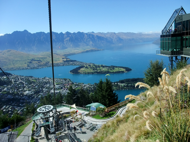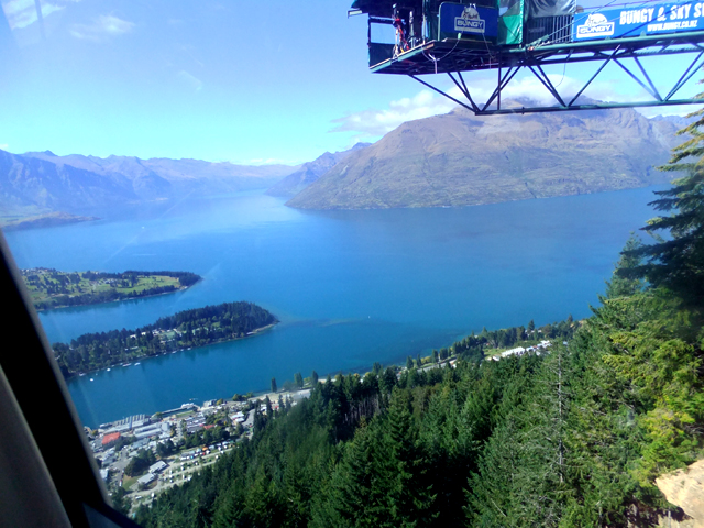 纜車沿著陡坡攀上,往下看,居然還有羊兒晃蕩,不怕蹄子一滑就摔落山底嗎?儘管從車廂也可遠瞰湖色,然經過熱汽球的洗禮,眼前這樣的景致就沒太大衝擊了。倒是側邊懸崖拉出個架空走道,末端便是高空彈跳,儘管望出視野景物宜人,但要一躍而下還是需相當勇氣吧。