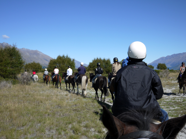 我們在原地先學習操控,基礎的倒還單純,右手扯韁繩便是右轉,左手拉則為左行,雙手同時回提可煞車,兩腿輕敲馬腹暗示前進。大家排成縱列後,工作人員一領前一押後,就帶著大家走出馬場。而這些馬兒大概訓練有素,不用怎麼搭理,自然一個跟一個,乖乖往前擺尾踏步。於是魔戒遠征軍,便向著蒼茫山色行進。