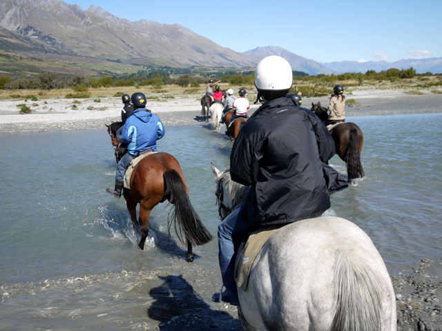 走著走著,前方河流蜿蜒擋住去路,馬群們大概熟門熟路,毫不猶豫就踏蹄入溪,頓時水花四起。不知電影內的某些越河場面是否就在近處,我自己幻想後面半獸人追兵無數,大夥亡命奔馳,倒也是番樂事。