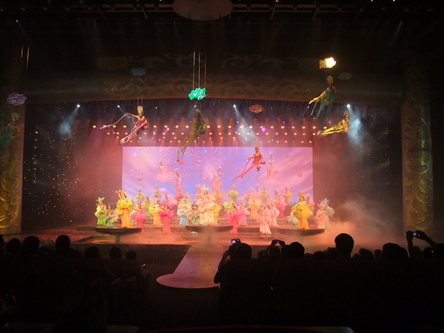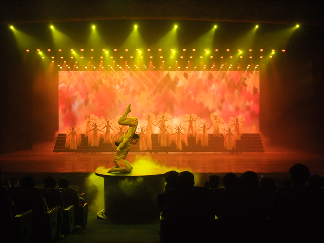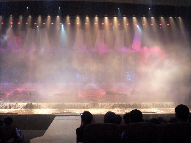 晚飯過後,踱至旅館旁劇場,環境設備相當嶄新乾淨,場地也很開闊。因為買的是中價的斜偏座位,導遊偷偷跟我們說,開演時可溜去沒人的高價區。不過還好後來自覺理虧,僅摸至VIP區後一排,看有人過於貪心,大大方方在前方大沙發才一坐,就馬上被服務生請走了。
