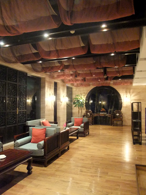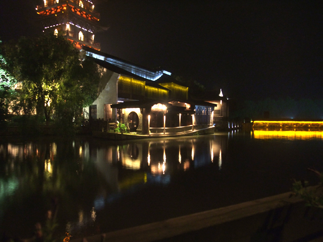休息過了,我從酒吧區旁貼水而過的折曲橋走近「白蓮寺塔」,塔下似有個水榭或畫舫,看不清晰,不過其雕花及洞門,卻因燈火勾描,而顯得引人。