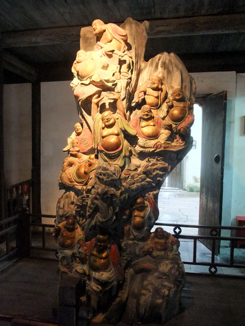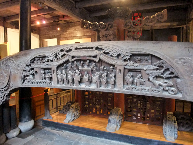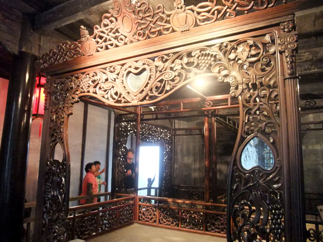 離開這一區,我們在小巷間,走上一陣,再踏過小支流上的短橋,進入「江南木雕館」。這兒顧名思義,展出的就是當地精湛之木工技藝了,可以看到類似廟宇裡的蟠龍柱、簷下柱頂間的支撐板。這些藝品以小人像的細緻面目,襯上鏤刻數層的纏繞花鳥,透顯出工匠的巧思與手藝。而館內最主要的展品是「郭子儀祝壽騎門雕花大梁」,長四公尺的樟木,不像印象裡橫樑的平直,而是略呈拱弧狀,兩端淺印雲紋,中段則刻深為主題畫。盤松疊簷下,形貌各樣的小人偶們,排列著對中央的郭子儀作揖祝壽。在富含層次的景深中,勾勒出人物動作的栩栩如生。