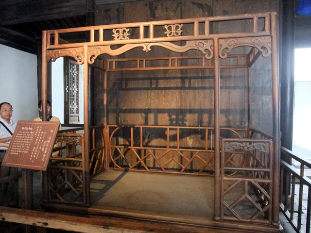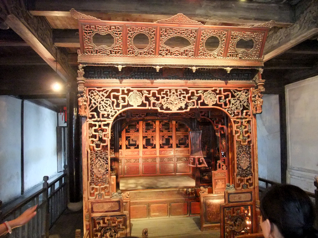 當中有些大戶人家故居被改裝成小博物館,我們第一間遇上的是「江南百床館」。進門大廳擺著明代「馬蹄足大筆管式架子床」,這展品不見床板,看來似是原本形構的外框,其支架如名,以木管拼連至天花板,無太多裝飾,只有簡單木條交錯及淡淡雲紋。