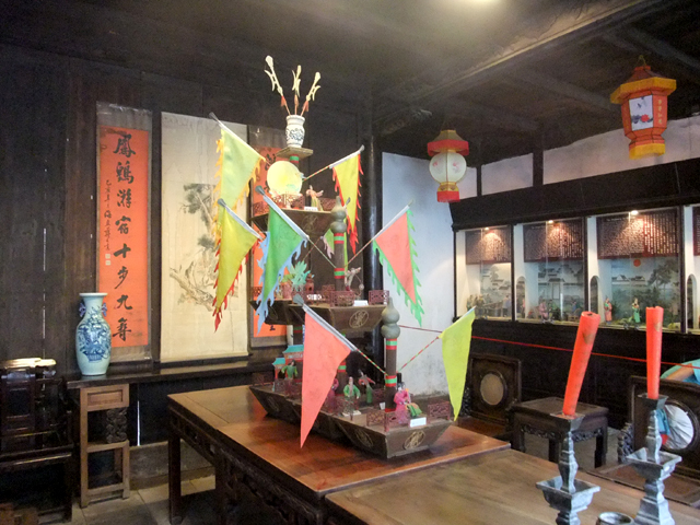 隔壁幾步之遙的「江南民俗廳」則以蠟像搭配文物,呈現晚清至民國時期此地的民俗風情。從衣俗廳可窺當時服飾,節俗廳的一些人偶及微縮模型,則敘述與四季節氣對應的活動,像是春節、元宵、端午及中秋,而婚俗廳擺設了花轎與嫁妝,壽俗廳則以壽幛、壽桃等相關物品,烘托祝壽主題。由於展物品質一般,大夥也便走馬看花隨意觀覽一圈。