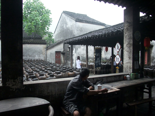 下個街區,我們走進「三白酒坊」。一入店門便是濃醇酒香,從走廊穿至後院,空地裡滿滿的釀造酒缸,而老闆在加工廠裡熱情招呼我們試喝。據說明太祖朱元璋登基之時,此酒坊前身,曾以白米、白水、白麵所製之三白酒作為貢品。然對酒略為排斥的我,考慮一會兒,還是放棄探驗其滋味。倒是環視這廳間,幾盞紅燈籠、一匹布繡著大大「酒」字,很有古戲中鄉野酒肆的意味,但窗前一老人,呆坐著望向院內酒缸,又將畫面染上衰頹蒼涼的昏暗色彩,讓人不勝唏噓。