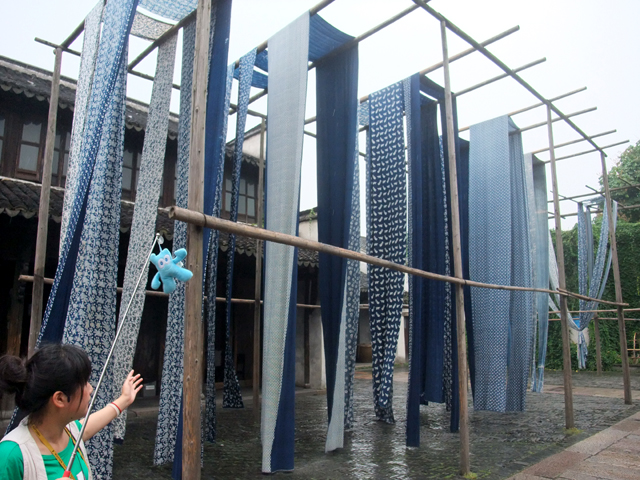 隔鄰是「宏源泰染坊」,展示當地很有特色的藍白印花布。在後院裡,竹架高高撐起迎風飄蕩的長匹布,花瓣形樣的白印紋在藍帶上重複著,像是一隻隻粉蝶。一旁老師傅稍稍示範這俗稱石灰拷花布的作法,看來是用預先設計好的塗花板,將白泥印上藍布。只是我很好奇,這樣幾經洗滌,白泥都不會脫落嗎?旁邊還有間小展覽館,印花布跳脫一般衣著用途,以藝術畫方式呈現。尤其一幅仿清明上河圖的印畫,將著名拱橋上熙熙攘攘人群、市集,鉅細靡遺染印而出,讓人不禁端凝再三。