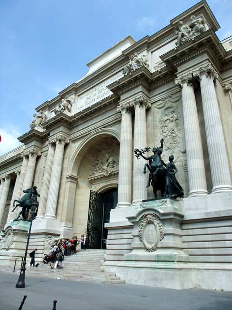 大皇宮最醒目的是它呈橫十字的大玻璃穹頂,這幾日乘車經過都可瞥見那拱弧在陽光下閃爍生輝。而其另外的視覺焦點則為建築兩端的大型銅雕。若從香榭麗舍大道拐進,可以看到轉角處切成凹弧狀,高舉花環的女神立於門柱上頂簷,前方四匹駿馬分躍如開展扇面,舉蹄嘶昂,氣勢非凡。
