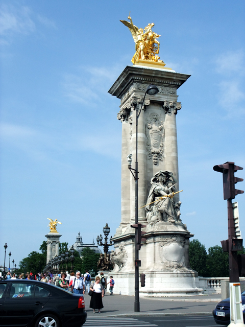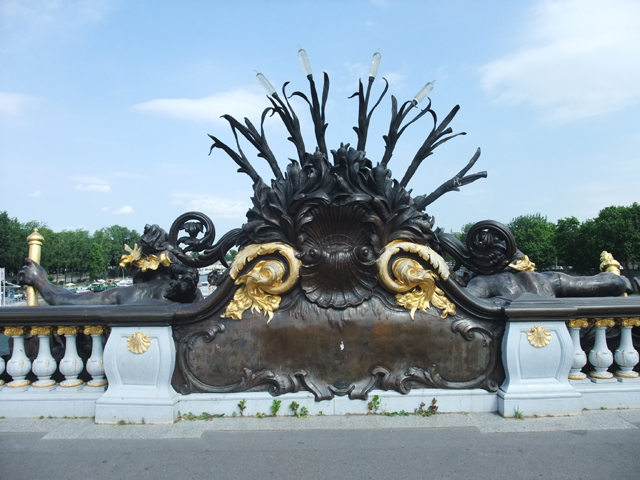 橋頭立柱在近距離仰看下,更顯高聳,而我也終於看清橋樑那些小小雕像的形貌。這些天使有的與游魚嘻玩,有的拿著海螺仔細聆聽,圍繞華麗燈柱的小童則圓圓胖胖,姿態相當可愛。而昨日行船時,橋中段所見的女神護持徽印,背後原來是由花卉簇擁的扇貝。