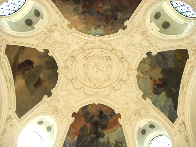 除了前方這主要的大展場,大皇宮後方也組合了數座博物館。背側的科學發明博物館有著像凱旋門般的立面,弧門外以立柱分劃的牆面,精細地綴上浮雕與銘文。看到一群孩童快樂奔入,我也好奇地進去,在大廳找個靠牆座椅歇下腳。圓形大廳有著玻璃拱頂,如花苞中心般,向外開綻了雪白瓣葉,瓣緣以複雜的雕刻工法,連綿至黑金支柱上的人像。隨便踏入一棟建築都有如此精細繁複的裝飾,實令人訝歎。
