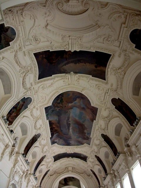 望著大門許久,瞥見許多遊客陸續進入,我就也跟著穿門一探。入口大廳十分寬廣,由淡粉色的牆柱搭配雪白拱頂,拱頂分劃成十字區塊,彩繪著壁畫,整體感覺相當素雅。但在這份低調中,若仔細觀看,每吋每分的雕刻都不馬虎,像是被飛雪覆蓋的林葉,向兩側漫去。