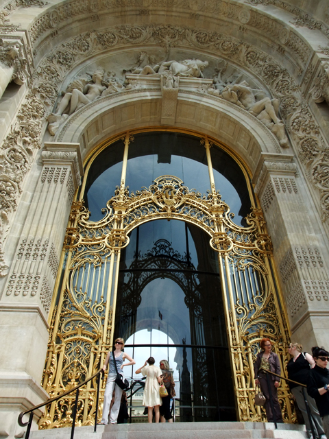 我先由小皇宮看起,橫長門面,在兩端灰藍拱簷下,以希臘式三角楣及立柱砌起高大的玻璃窗台。而正中圓拱頂下的大門是視覺焦點所在,叢聚立柱支撐著層疊內縮的拱弧,越往內刻綴的花飾亦愈繁密,最後收以坐臥的人像群。大片玻璃門扉更用燦金網紋彎曲纏繞,彷若繁花盛開,藤蔓綿延。