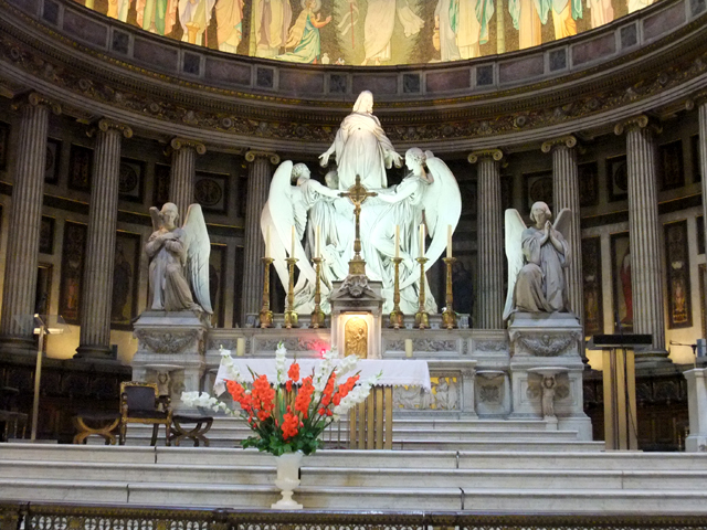 教堂大門框格內有一幅幅關於聖經故事的浮雕,以此開啟了這個神聖空間,廳內兩側似欲與建築外觀呼應,是一長列以希臘三角楣為頂的凹弧龕室,置放耶穌及眾先知的塑像。中央祭壇的瑪德蓮則由多位帶翼天使護擁,在柔光投映暈染下,衣襟飄然,緩緩升天。視線接續往上,圓穹頂的天蓬畫描繪許多跪伏主教聖者,似正聆聽當中基督的教誨。坐在位席上,看著這相對少人拜訪的教堂,這份寧靜不需繁複裝飾,卻也透顯出一種聖潔的氛圍,