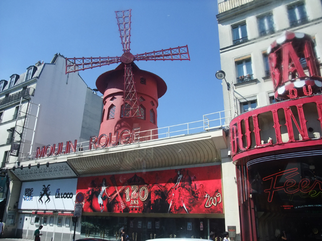 沿原路走下山坡,上車後領隊特意吩咐司機,帶我們繞至不遠街邊。紅色招牌與紅色風車,那是紅磨坊啊,團員們尖叫著衝去車窗旁,拿起相機狂拍。風車造型簡單,卻不知勾惹起世間多少故事。它那於夜間閃爍的霓虹,擺弄的裙浪,曾在電影裡連綿成華美的亭台花房,串起無限想像。但領隊卻潑了我們一桶冷水,說裏面不論舞台座位都相當侷促,在那觀賞不過圖個舊世紀氛圍罷了。然紅磨坊畢竟還是紅磨坊啊,大夥依舊定定望著它的風華,目送它遠去。