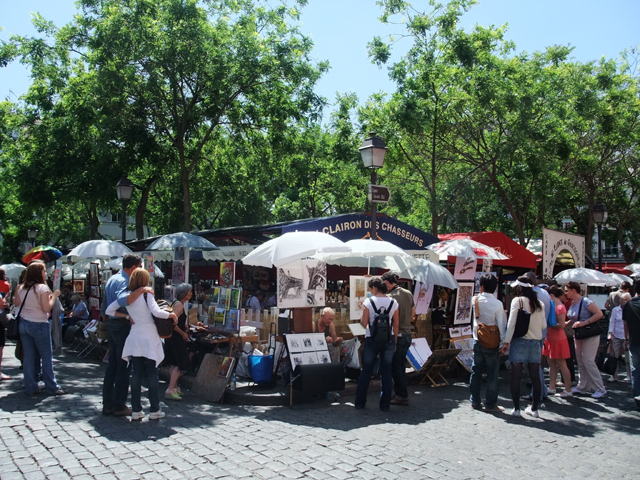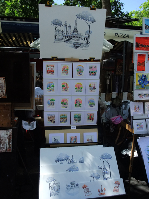 跟上隊伍,繞幾個彎,我們來到個小廣場,遮陽傘與棚架下穿流著觀光客,這兒便是畫家村了。許多藝術家在小小的攤位販賣作品,也為人作畫。畫作主題多半是巴黎著名景點,但卻衍生出各色風格,灰階淡彩的、染墨印象的、繽紛巧趣的,一路賞玩都讓人驚嘆其創作的新意。當然也有即席替人素描的畫家,或以漫畫風格隨意揮灑,抑或用工筆老實仔細地暈抹刻繪。望著他們專注細心的神情,不禁感念其在生活壓力下,依然堅持藝術之路的執著。