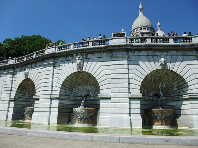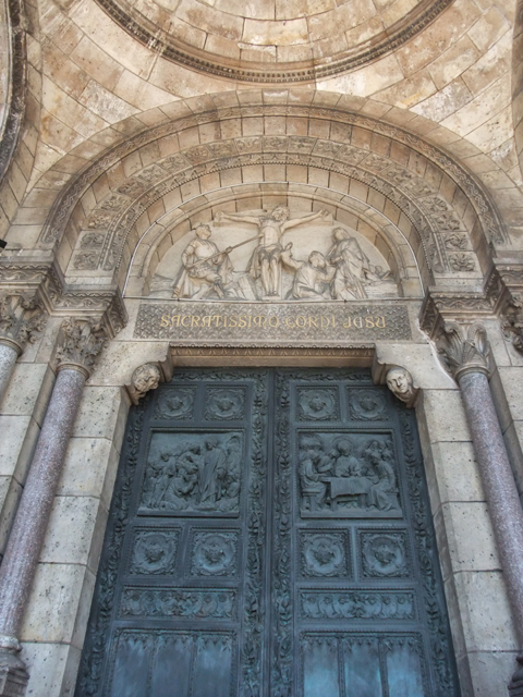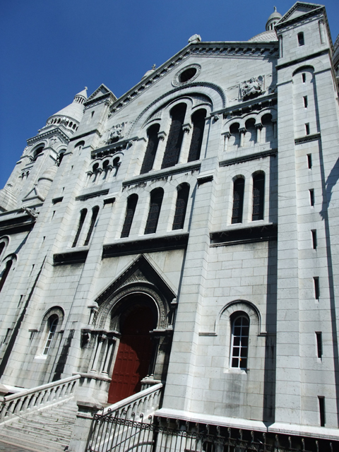 此教堂緣自普法戰爭,當時巴黎遭受圍困,之後經善心人士的發願、集資,最終完成此一建築,感念基督帶領法國度過災厄。據說所用石材若經雨水濡濕,會分泌白色物質,因而常保教堂潔淨如新。我在門口往上端望,廊柱簡潔錯落搭配,不需太多的雕刻綴飾,卻以最自然的明亮色澤,引出人心底的無瑕澄淨。