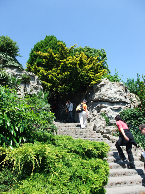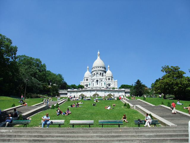 下午,我們來到蒙馬特,登上山丘準備拜訪聖心堂。街道兩側擠滿紀念品店,看得人眼花撩亂,大夥依循坡道邊走邊逛,一會兒便到達教堂區的花園入口。此處雖有小纜車節省腳力,但反正登頂路途不遠,在公園綠地緩緩穿遊而上也是有其趣致。