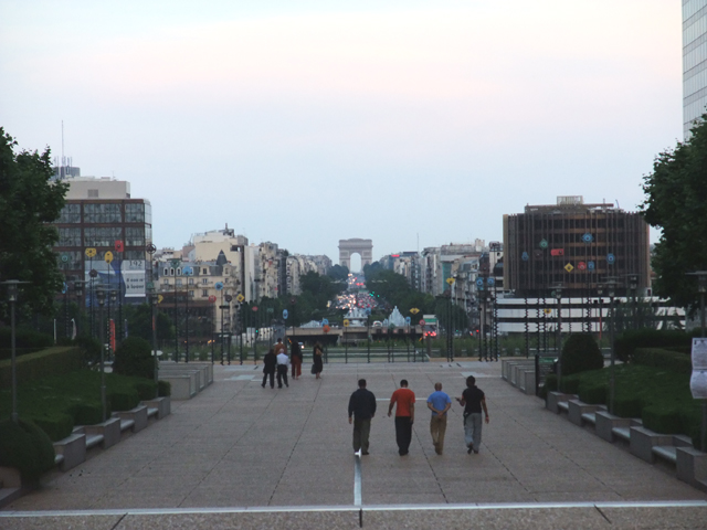 放完行李,大夥不約而同逛到花園大道,感受巴黎的日落美景。往香榭麗舍大道那方俯瞰,我們還未拜訪的凱旋門聳立在街道之末,而在另一側,新凱旋門以簡單的折角結構,遠遠與其呼應。