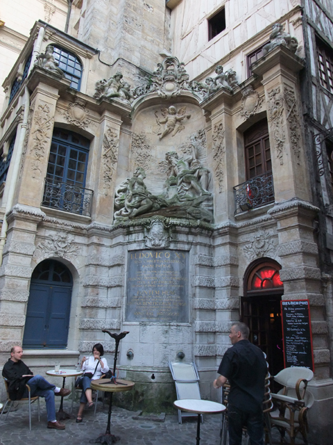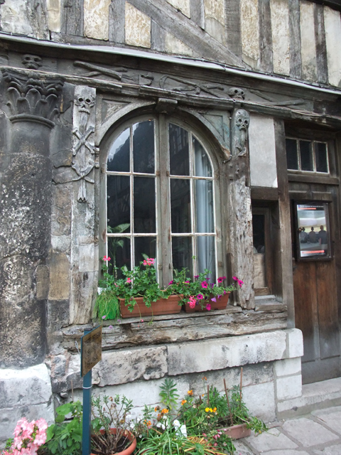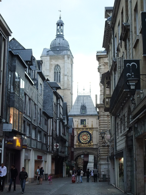離開教堂,走進繁華街道,其實這座諾曼第歷史古城還遍布藝術作品,大至樓閣門面的立飾,小至轉角處的紀念碑,都是富有生命力的躍動線條。街心另有座鐘塔,門廊上是黑底鑲金的鐘面,旁側則是高高立起的塔柱,最頂繫掛著數座懸鐘。